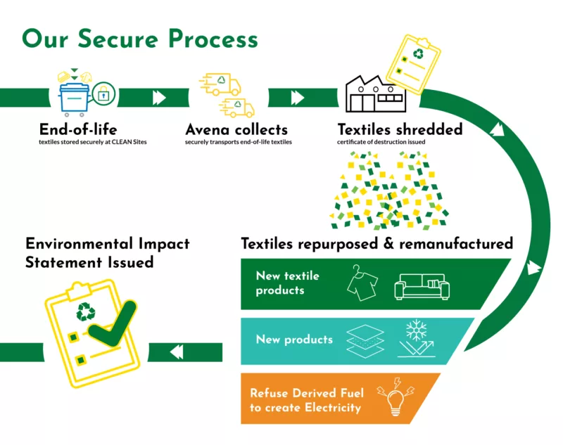 This is Avena’s first choice and the most sustainable option. After secure processing, textiles are broken down into fibres and turned into new yarns or fabrics. These can then be used to make similar products, like uniforms or linens, keeping materials in circulation.