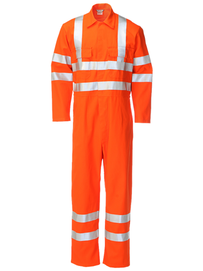 Multi-pocket high-visibility boilersuit with sew-on silver reflective tape. Suitable for the rail industry, conforming to