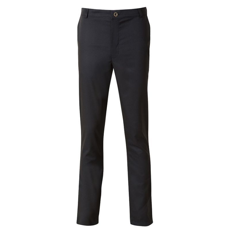 These formal chef trousers are designed with a slim tapered leg and crafted from a high-quality blend of 65% Polycotton and 35% Cotton flexi-stretch fabric, ensuring ultimate comfort. They feature a modern style and fit, complete with two hip pockets, a rear pocket, and a keyhole button fastening, making them both functional and stylish for any kitchen professional.