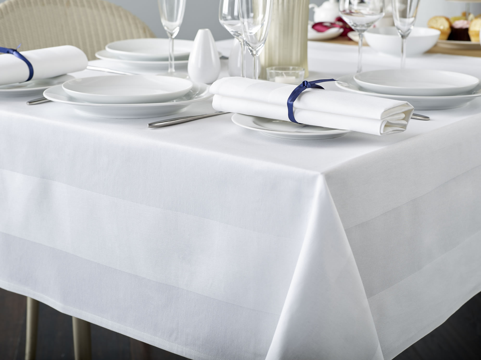 A satin band design lifts the tone to create a refined meal setting on any table. Made from 100% cotton these table cloths and napkins provide a seamless crease free finish.